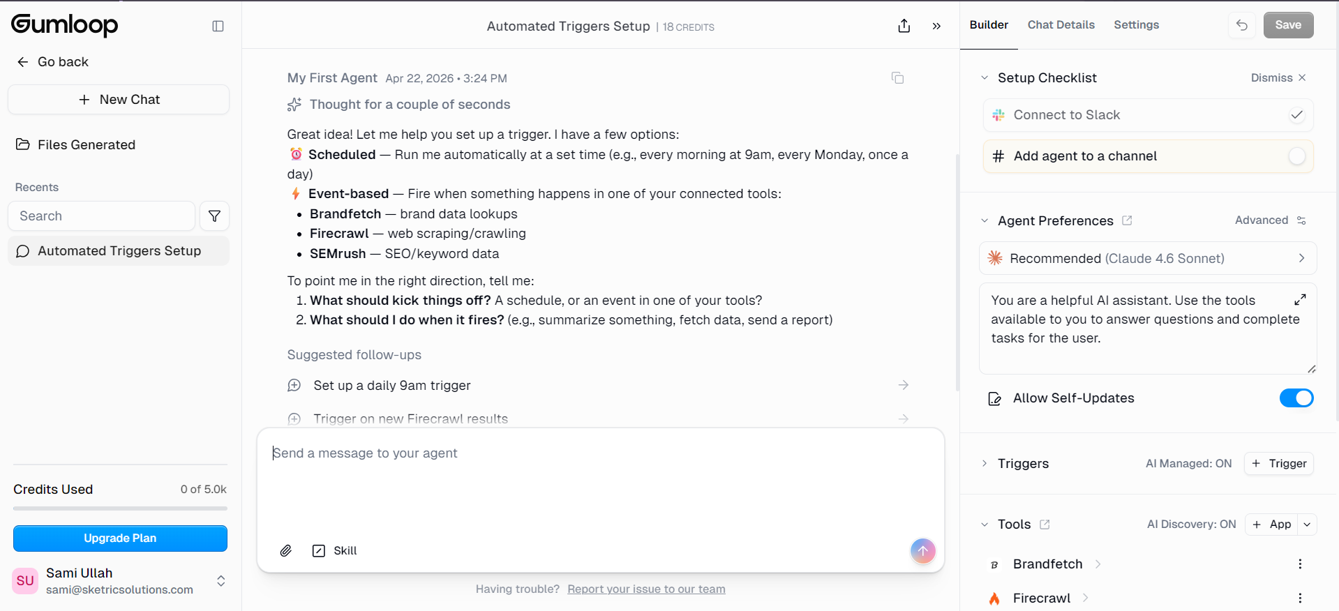 Tradeoffs: UI is less intuitive than SketricGen or Gumloop. Pricing starts at a free 200-actions-per-month plan and scales to $349/mo Teams plus custom Enterprise. Costs can rise fast if agents run continuously.