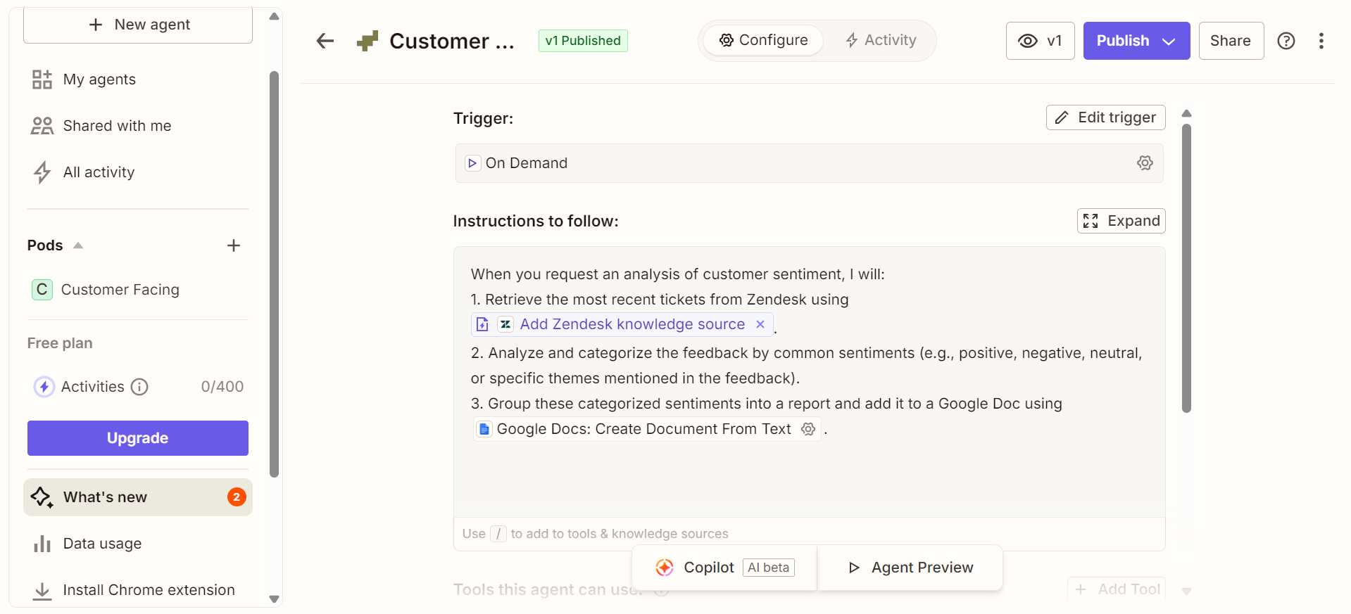 - Natural language agent creation (describe what you want, Lindy builds it)