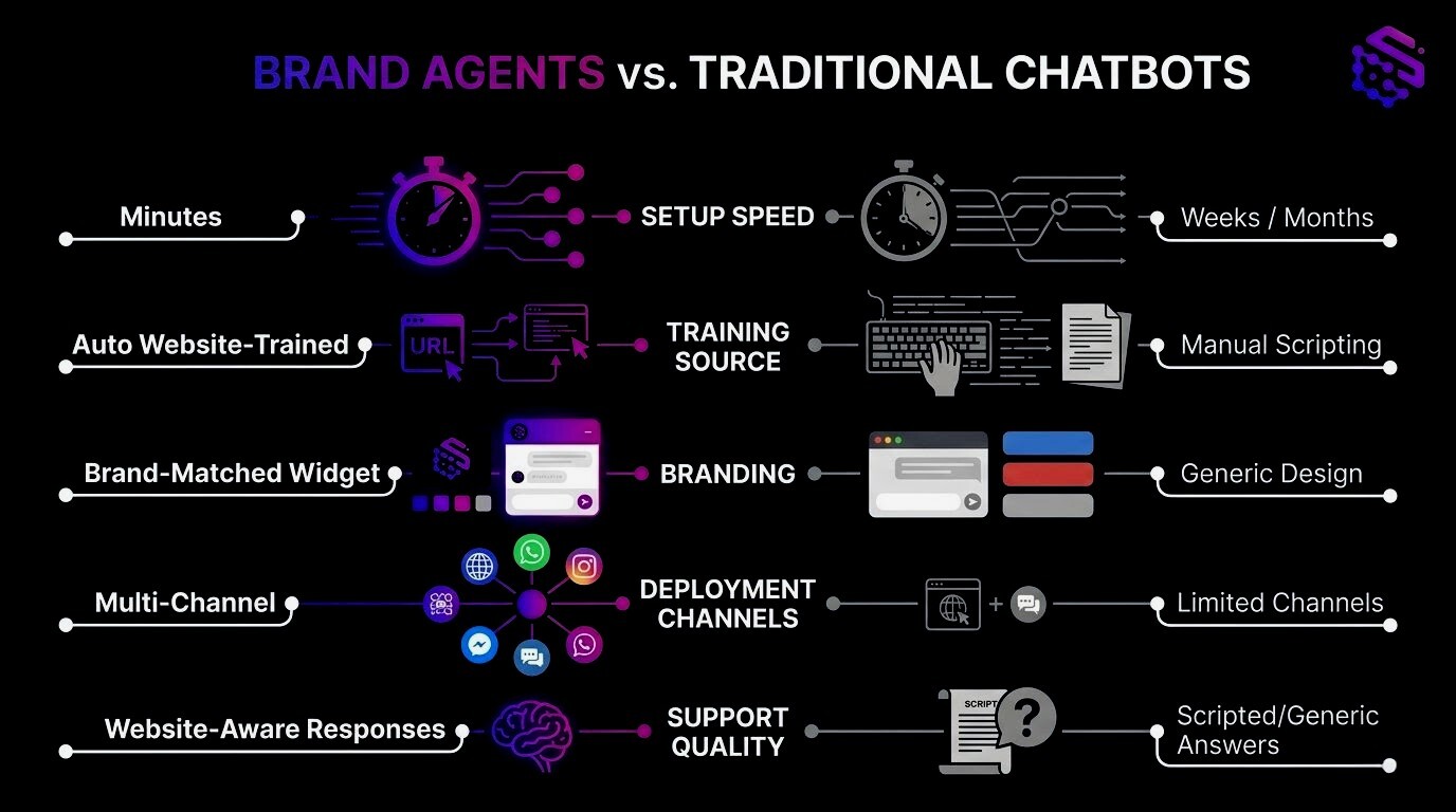 Pro tip: Start with one high-impact intent cluster first, usually pricing, support policy, and product fit questions. You get faster wins and cleaner analytics before widening scope.Brand Agents vs Traditional Chatbots