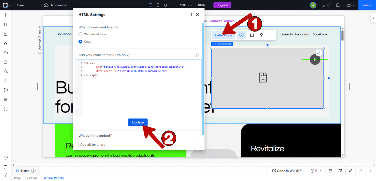 Paste the SketricGen code into the embed code field. You can adjust the size and position to fit your website’s layout. If you need more guidance on working inside the HTML/embed element on Wix, you can refer to the Wix Help: Add HTML iFrame or Embed Code to Your Site.