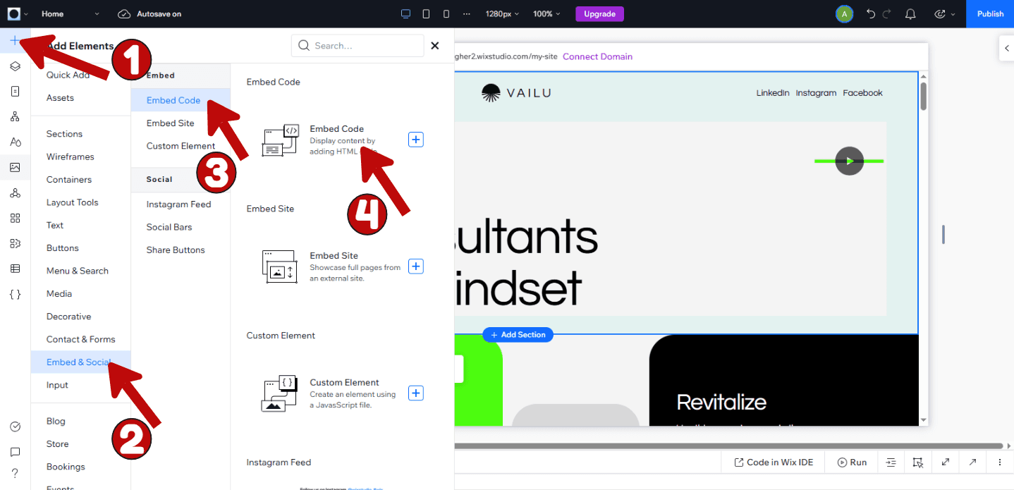 In the left sidebar, go to Add Elements. From there, navigate to Embed & Social and choose Embed Code. This is where you will insert the previously copied code.