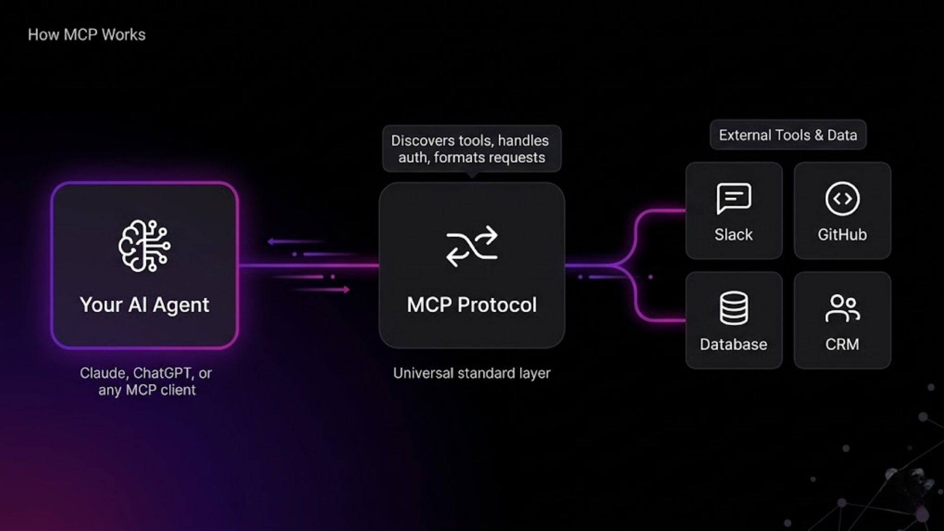 MCP (Model Context Protocol) is the connector standard that makes AI agents useful in real workflows. Think of it like USB-C for AI: one common way for models to plug into tools and data.